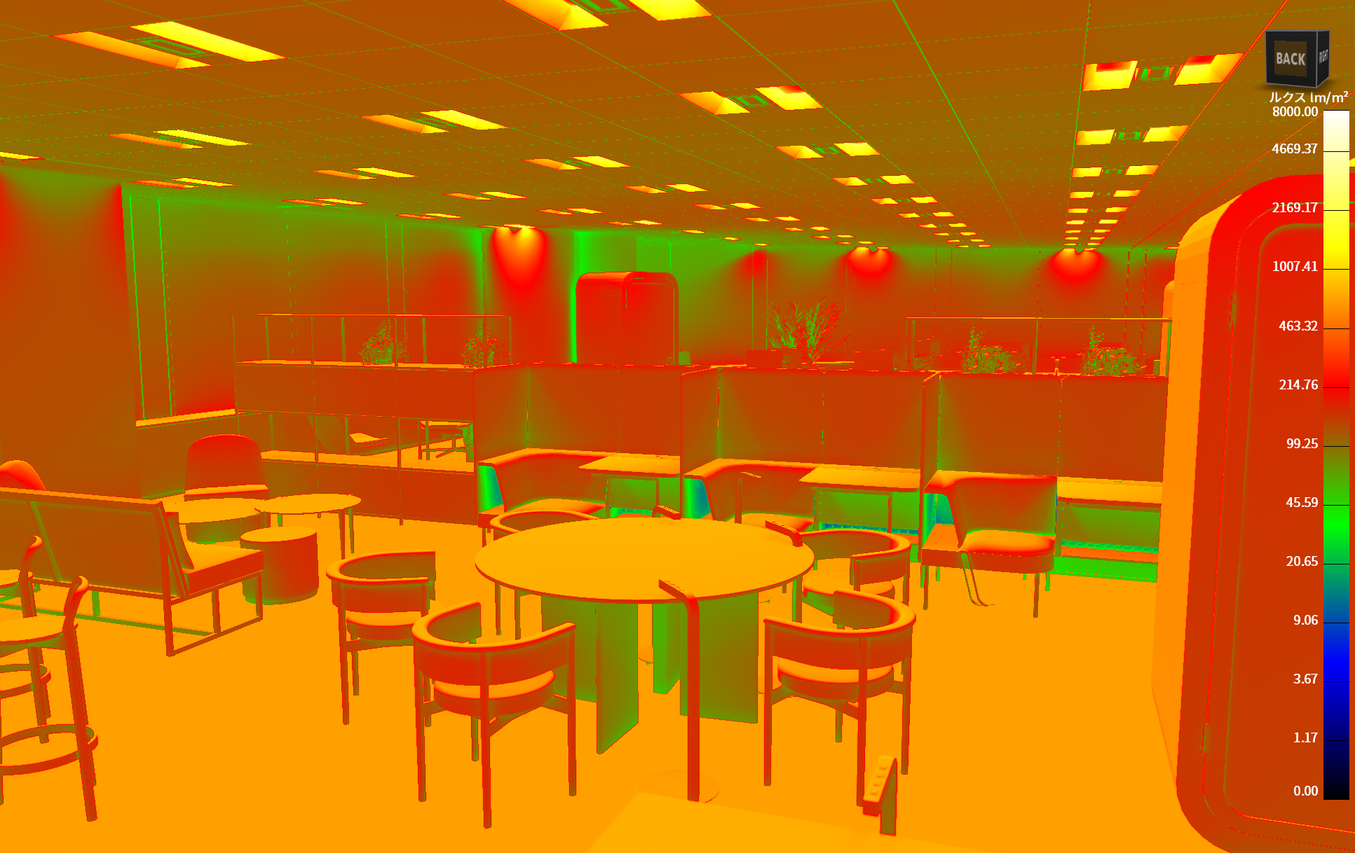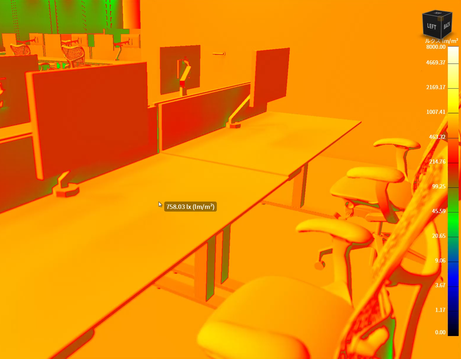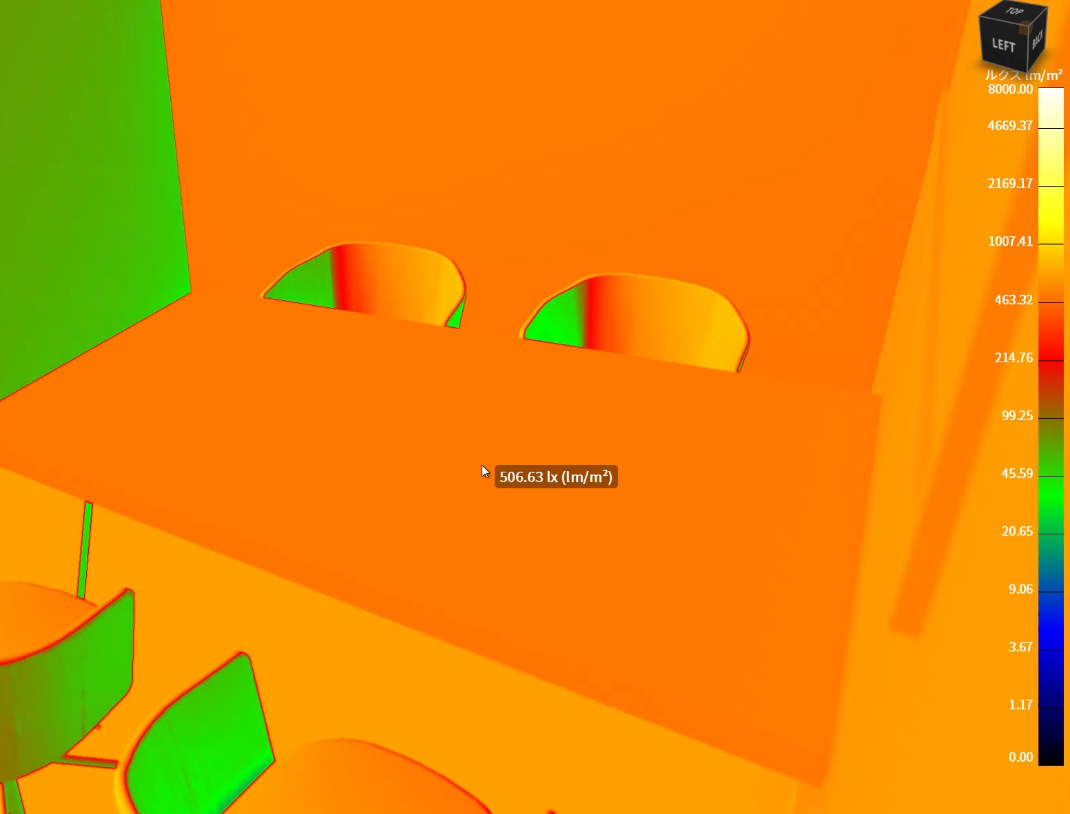 このようにCGシミュレーションで簡単に照度を測ることができます。
