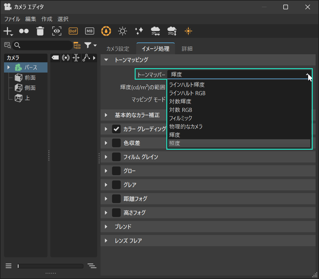 通常のRGB画像から照度や輝度への切り替えは、カメラ設定から行います。