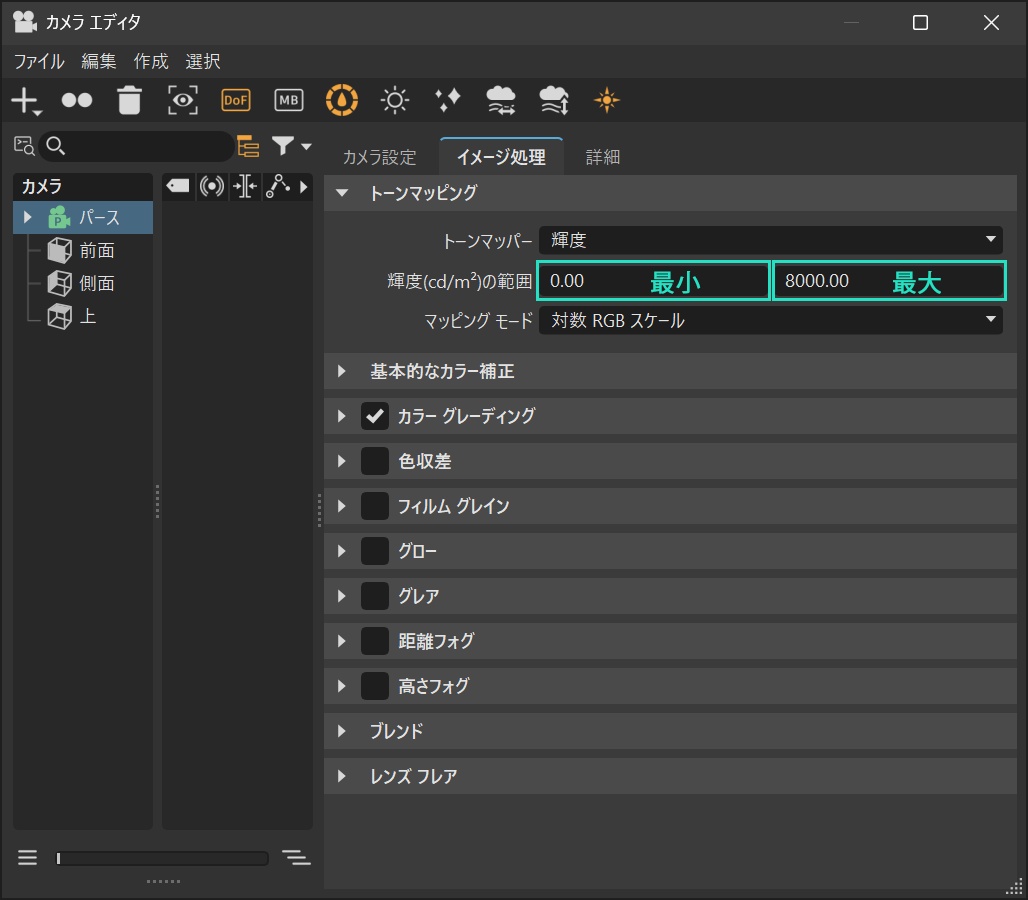 値の範囲はカメラ設定で行います。