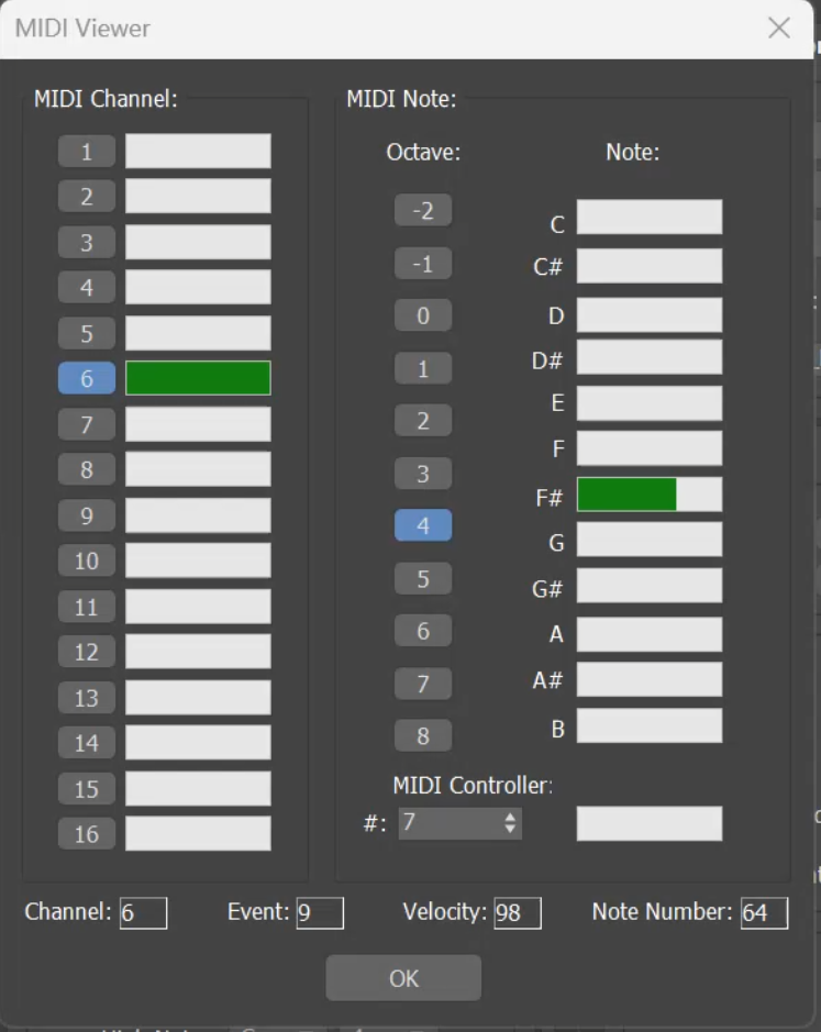 画像はMIDI Channel 6のF#4 ファのシャープでオクターブ4に信号が入っている状態です。