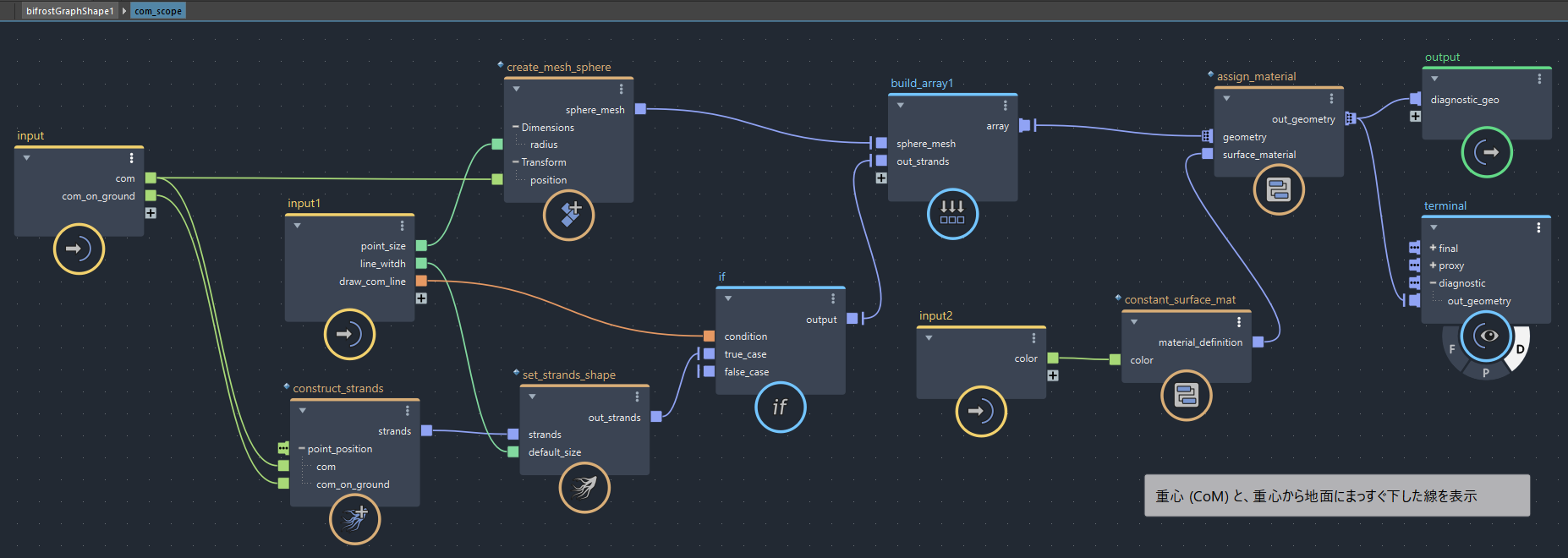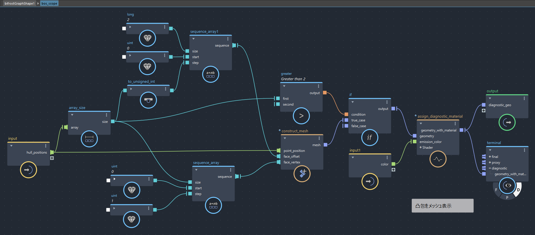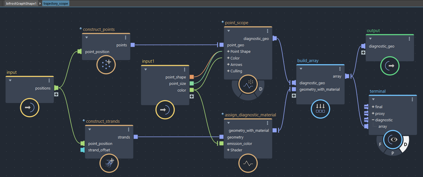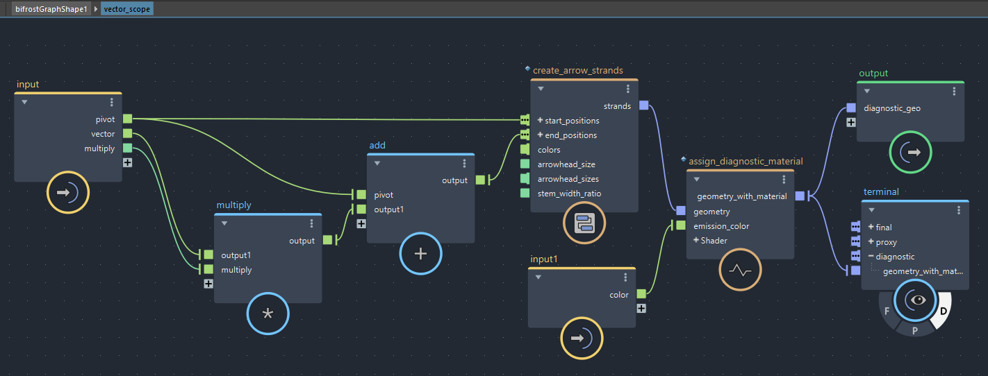 まずは予備知識として、Bifrostのビューポート描画機能について軽く触れておきます。これまでの過去回でも何度も使用してきましたが、Bifrostグラフには点やベクトルなどをビューポート描画する機能が備わっています。terminal(*1)ノードの diagnostic ポートに何らかのジオメトリを接続することで、レンダリング結果に反映させずにビューポート描画のみを行うことができます。scope系のノードでも同じことができますが、内部に terminal を使っているので本質的には同じです。今回はこちらの terminal を活用していきます。