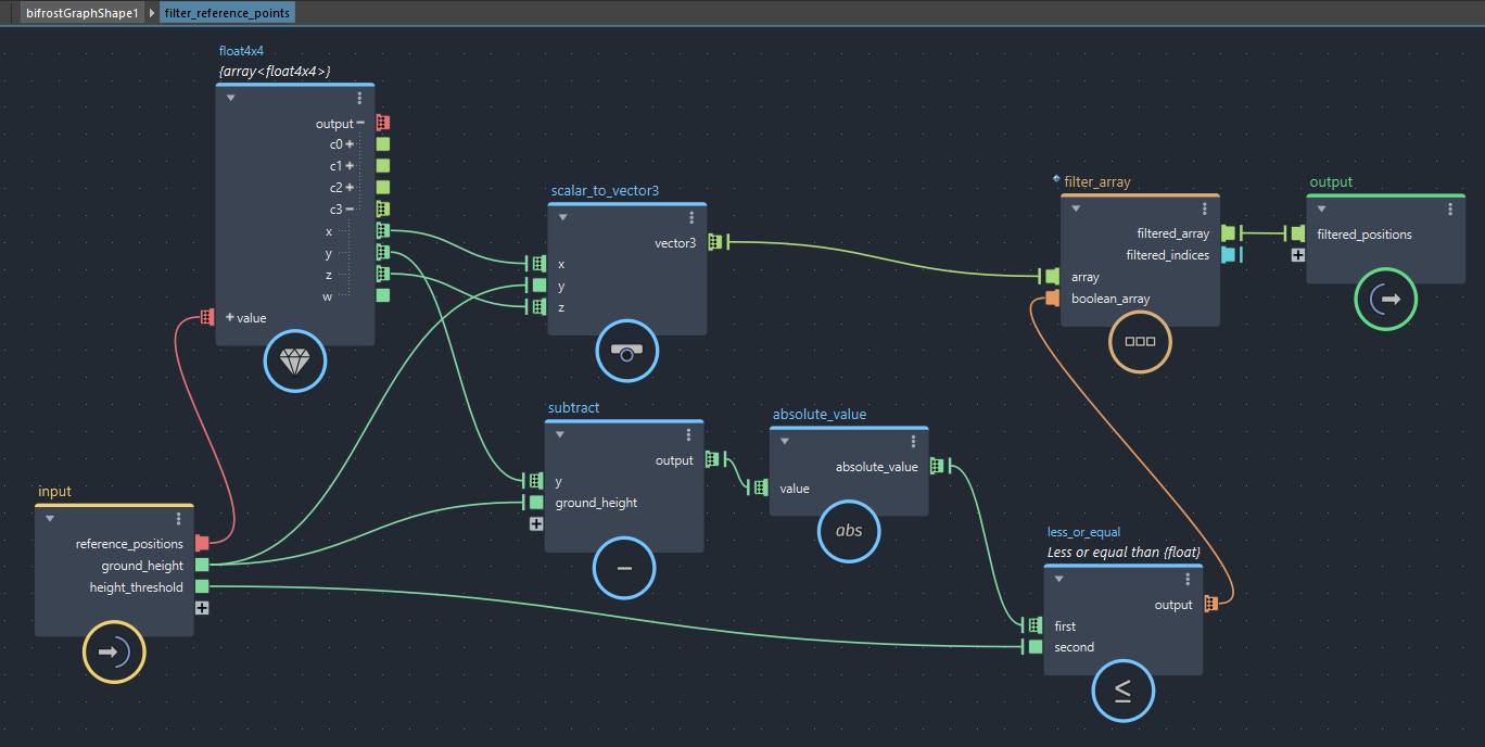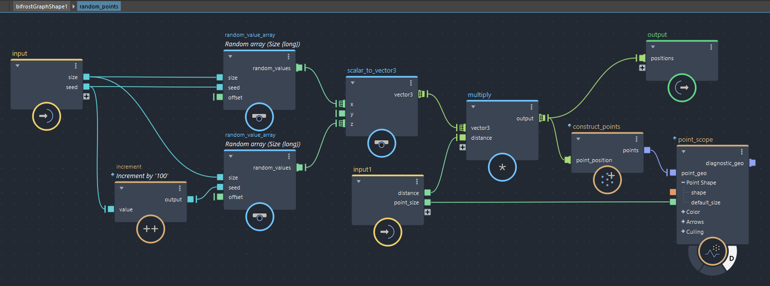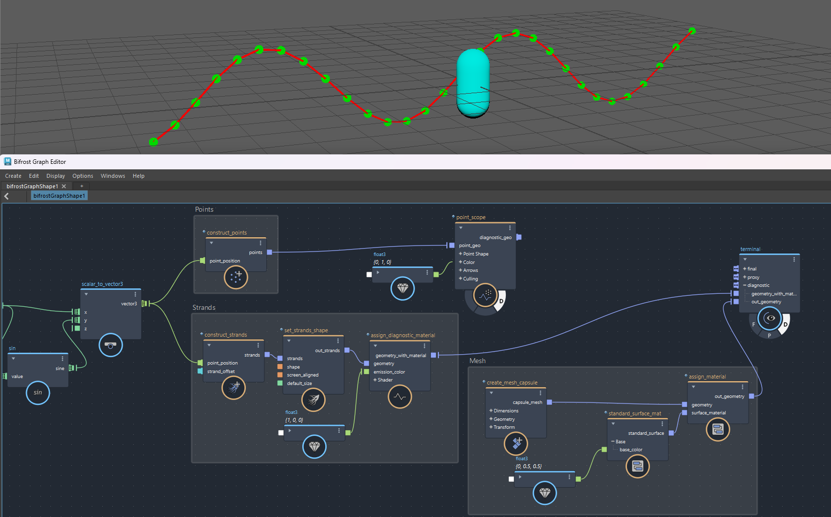まずは予備知識として、Bifrostのビューポート描画機能について軽く触れておきます。これまでの過去回でも何度も使用してきましたが、Bifrostグラフには点やベクトルなどをビューポート描画する機能が備わっています。terminal(*1)ノードの diagnostic ポートに何らかのジオメトリを接続することで、レンダリング結果に反映させずにビューポート描画のみを行うことができます。scope系のノードでも同じことができますが、内部に terminal を使っているので本質的には同じです。今回はこちらの terminal を活用していきます。