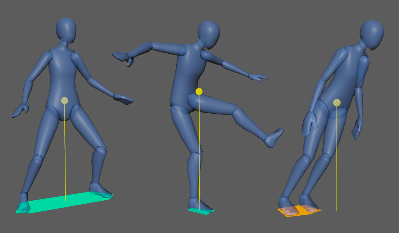 重心(CoM)はキャラクター全体の重心です。支持基底面は地面に接地している点で繋いだ多角形の面です。例えば両足裏をしっかり地面につけて立っている時は、左爪先、左踵、右踵、右爪先で囲まれた四角形がおおよその支持基底面になります。重心をまっすぐ地面まで下ろした時、この点が支持基底面からはみ出しており、かつ静止状態にある場合は『バランスを崩して転倒しそう』という目安になります。(※動作中の場合は、これだけで安定性を判定できるわけではありません。)