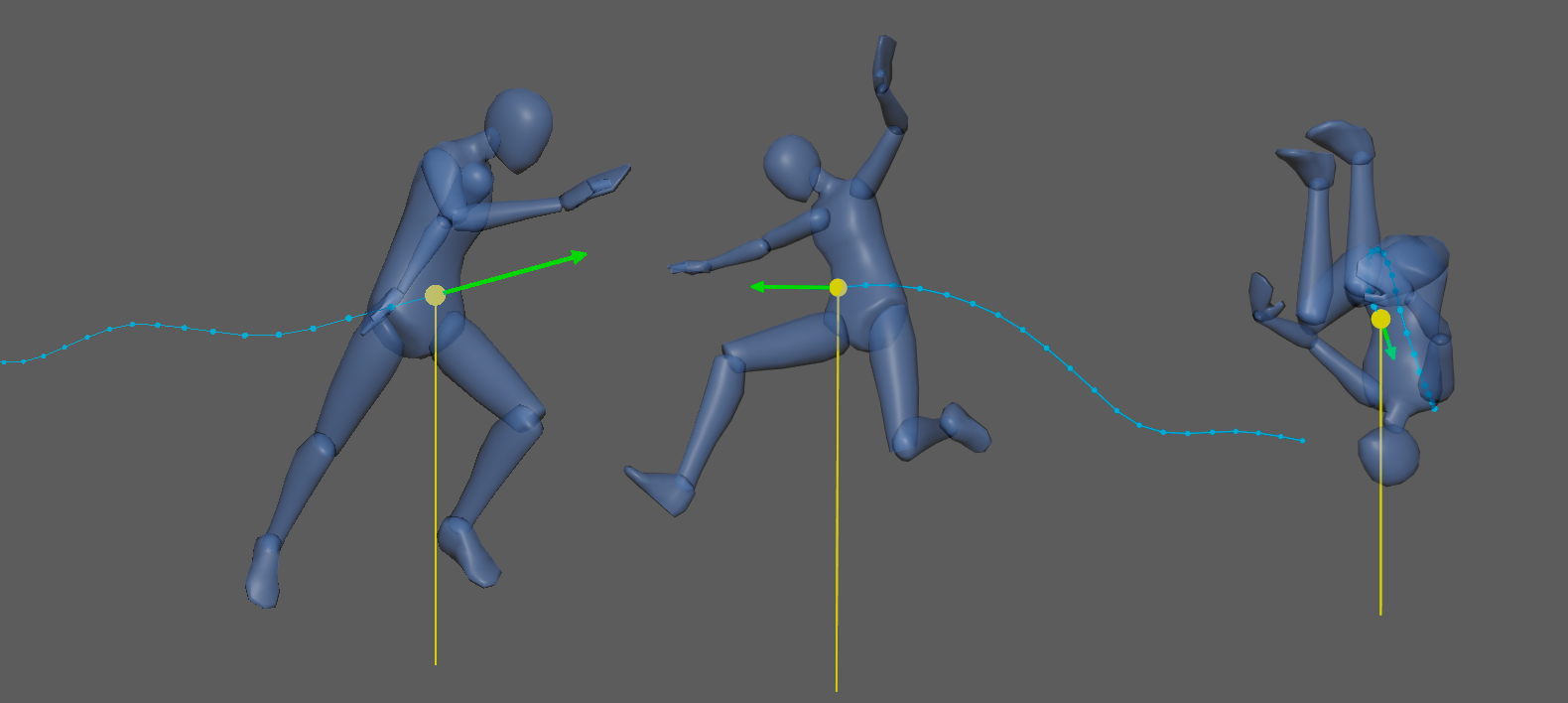 重心の速度は『この先どっちに向かうと自然か』の指標になります。前述の通り、強い外力が加わらない限り突然方向転換は出来ませんので、次フレーム以降もある程度この矢印の方向に進んだ方が無理のない動きにはなります。