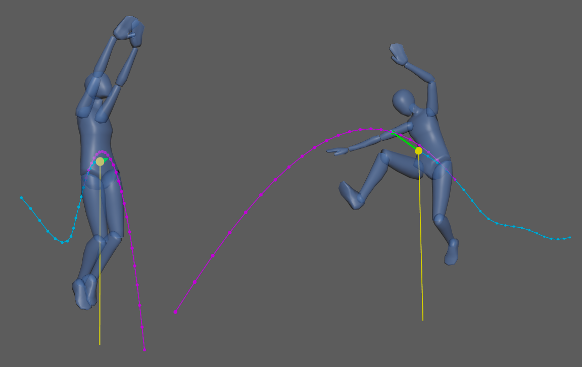 重心の軌跡は『物理的に無理な動きをしていないか』の指標になります。ある程度重量のあるモノであれば、壁にぶつかるなど極端な外力が加わらない限り、あまり急激な方向転換や停止はせずに滑らかな軌道を描くはずです。また、ジャンプ中などは原則滑らかな放物線を描くはずです。