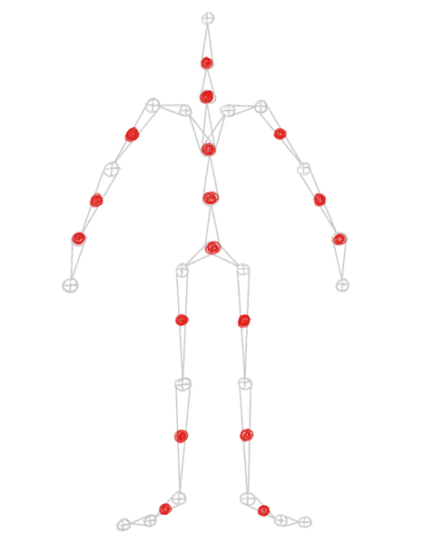 まずはキャラクターの重心(CoM)を求めるため、各部位に簡易的な質点を配置します。本来は長さや太さを考慮してできるだけ正確に設定すべきところかと思いますが、セットアップを簡単にするため各ジョイント位置をもとに以下のように配置する方法で進めます。