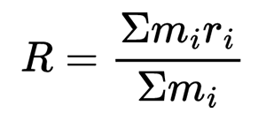 全体の重心 R は、各質点の質量 m とその位置 r を用いて以下のように求められます。ようするに位置の加重平均です。