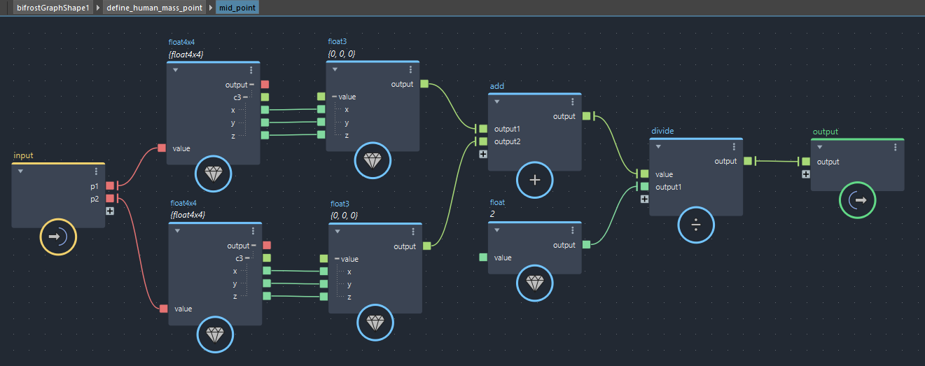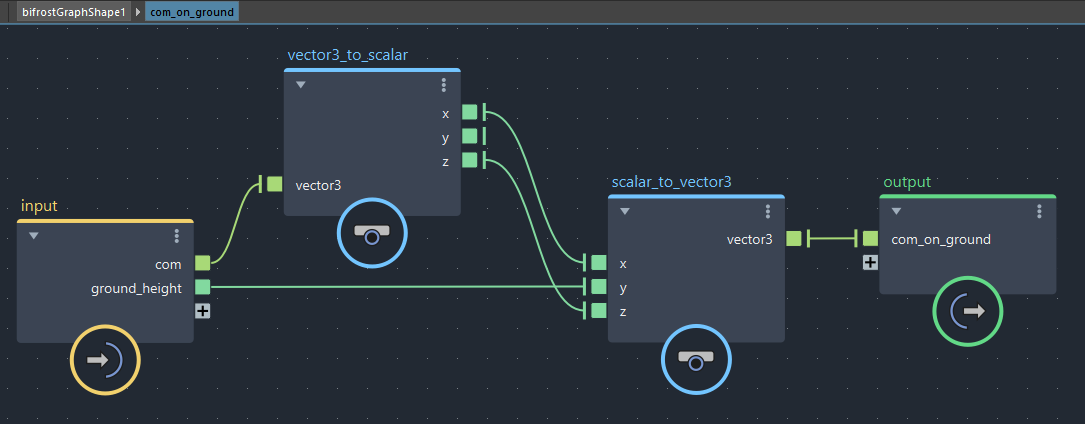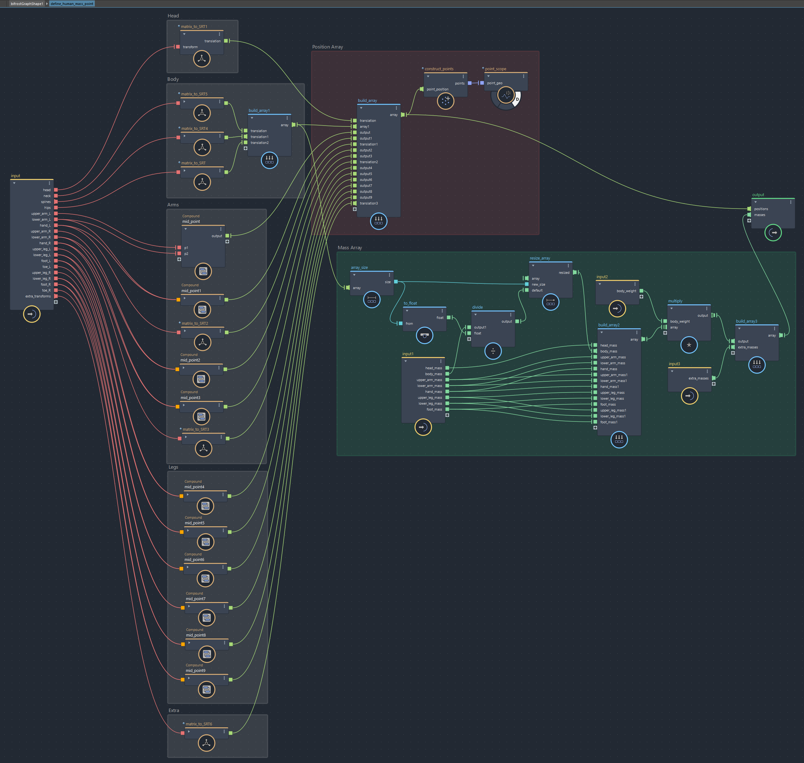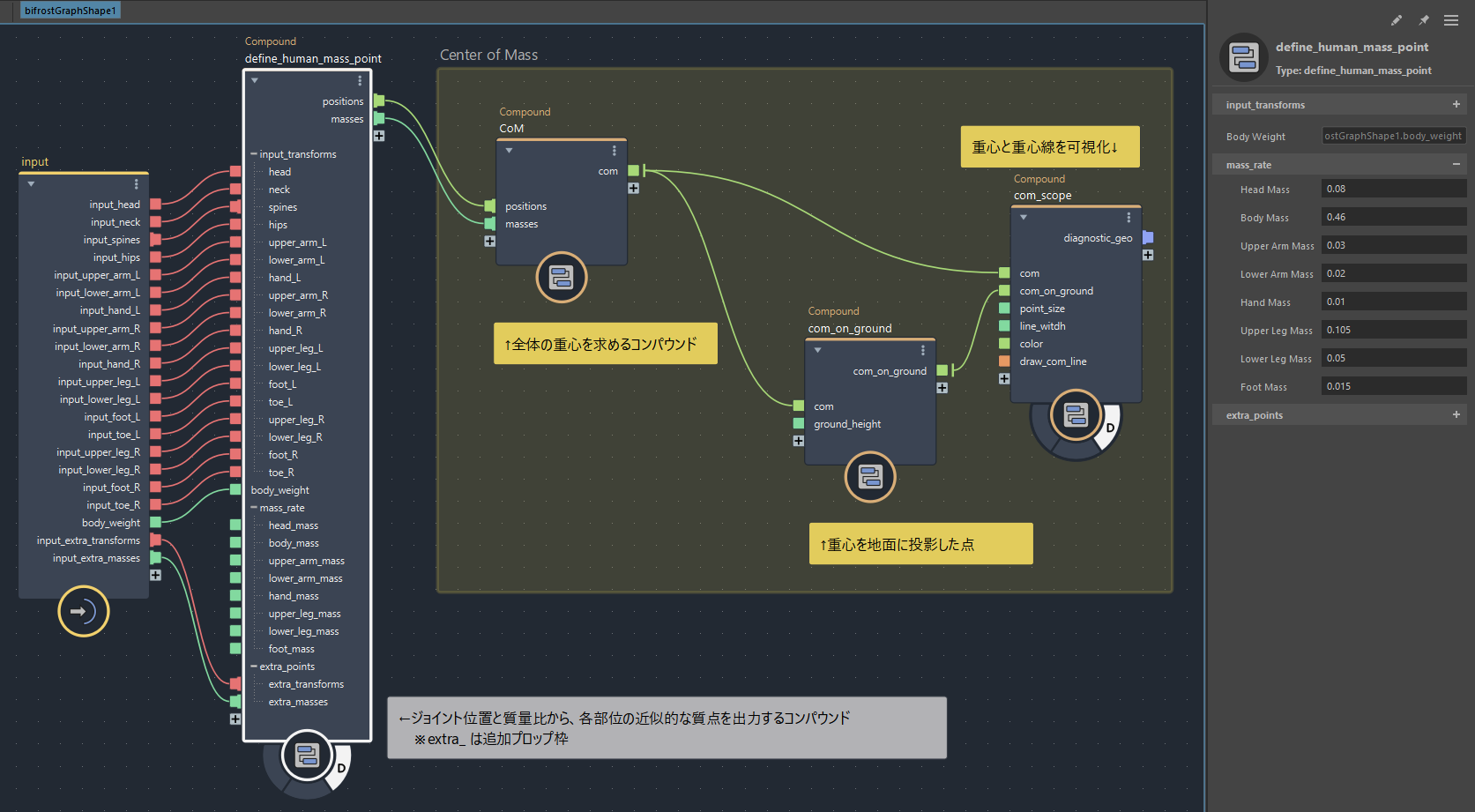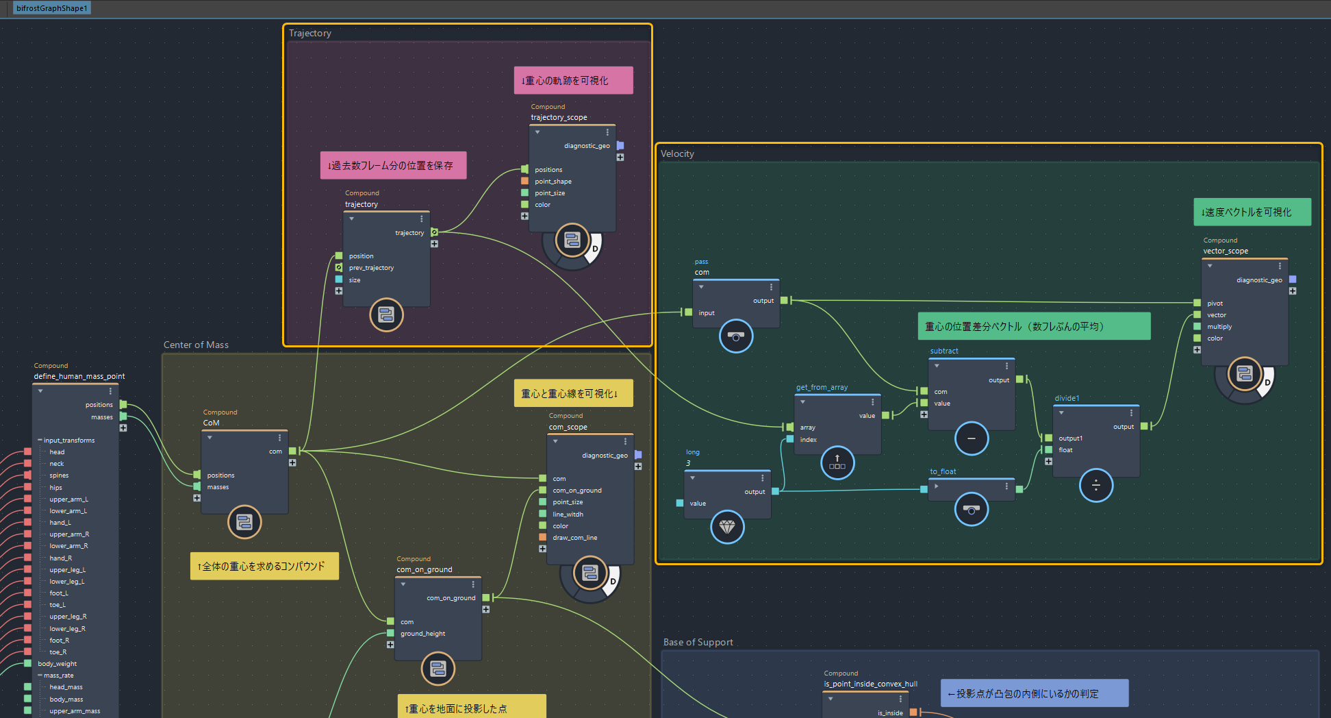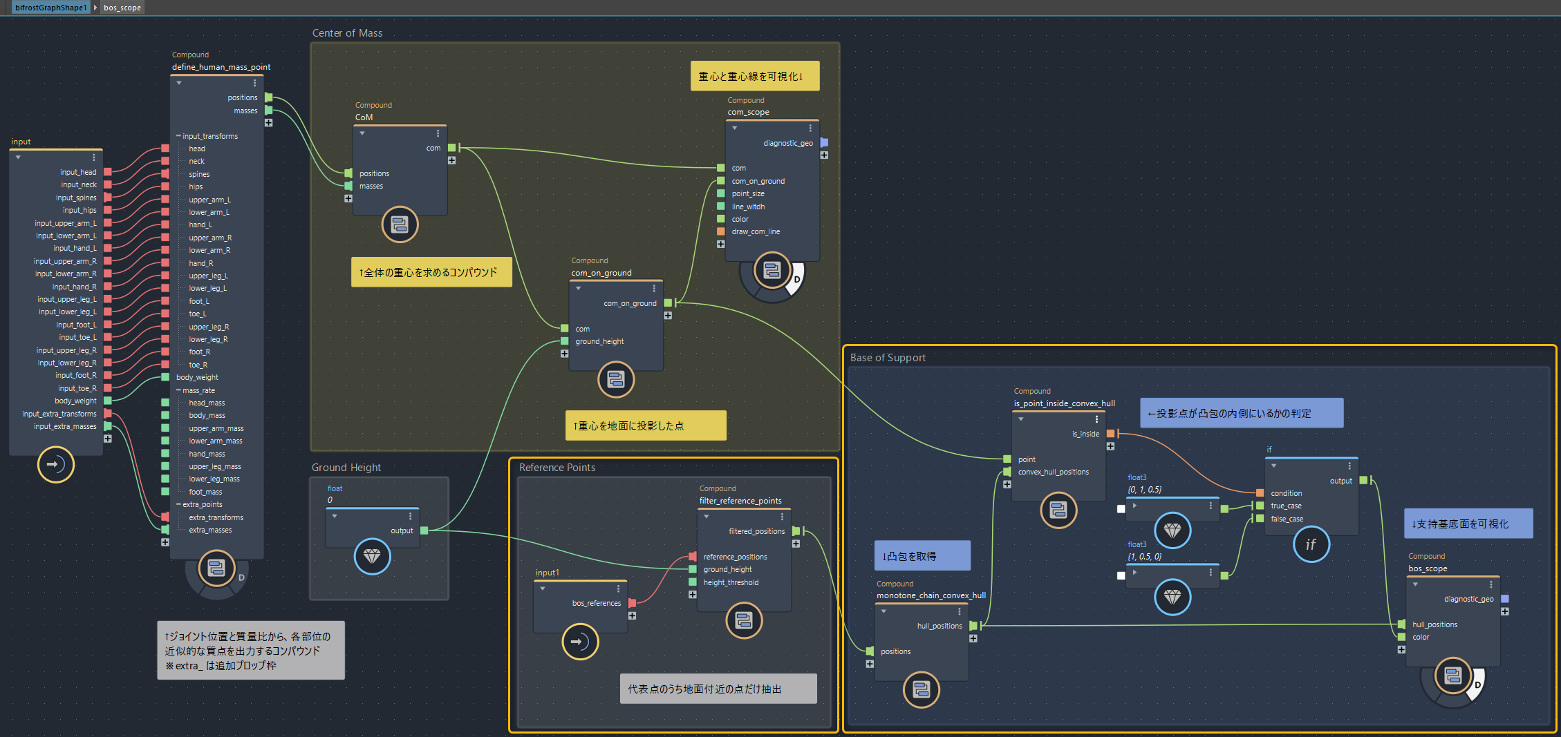では、これらのコンパウンドを前項の重心可視化のグラフへ追加し、キャラクターの支持基底面を取得してみます。代表点はひとまず両足裏に4点ずつ、計8点ほど配置してみます。