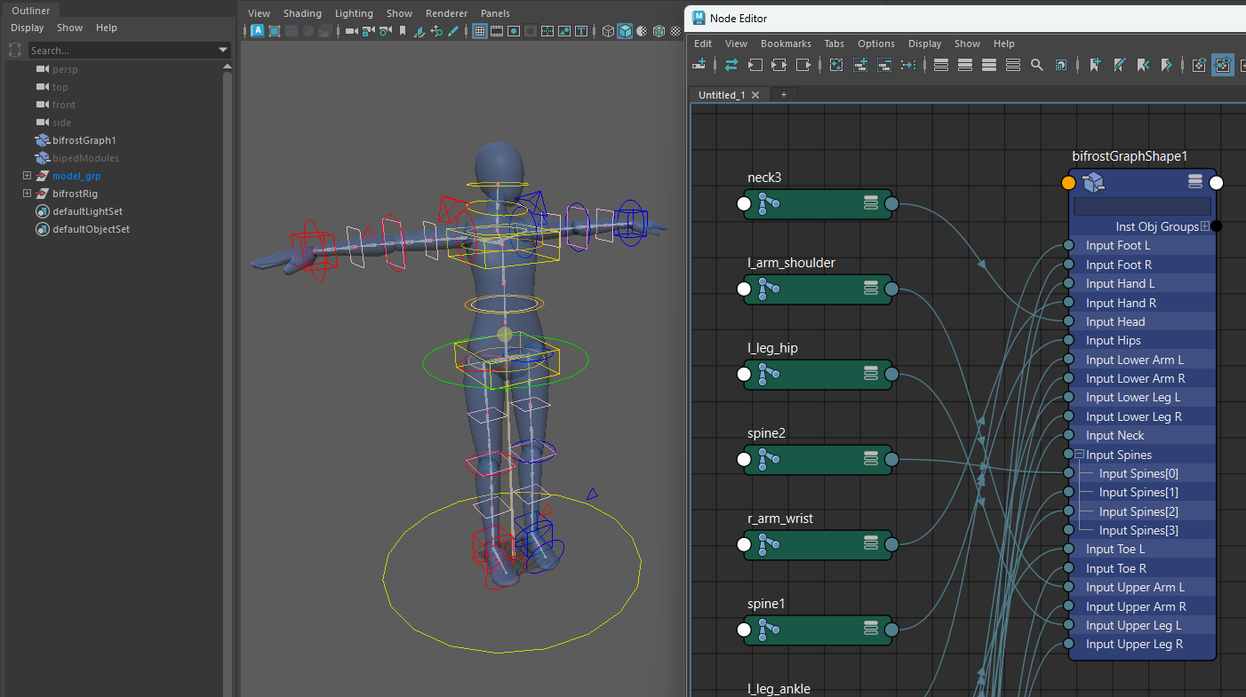 ではこれを人型のリグと接続してみたいと思いますが、せっかくなので前回登場した Bifrost Rigging のサンプルより「Biped Modules」を少し改変し、簡易的なモデルをスキンバインドしたもの使用してみます。各 joint の worldMatrix を、用意しておいた transform のポートに接続したら、あとは体重を設定するだけです。