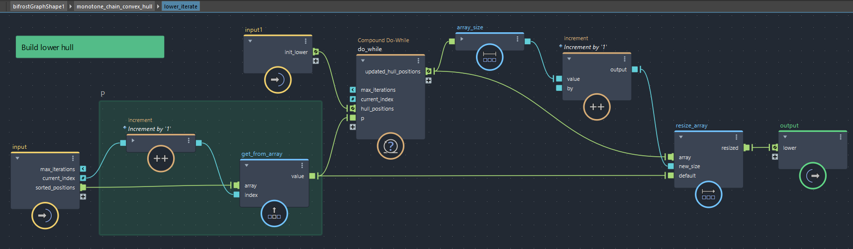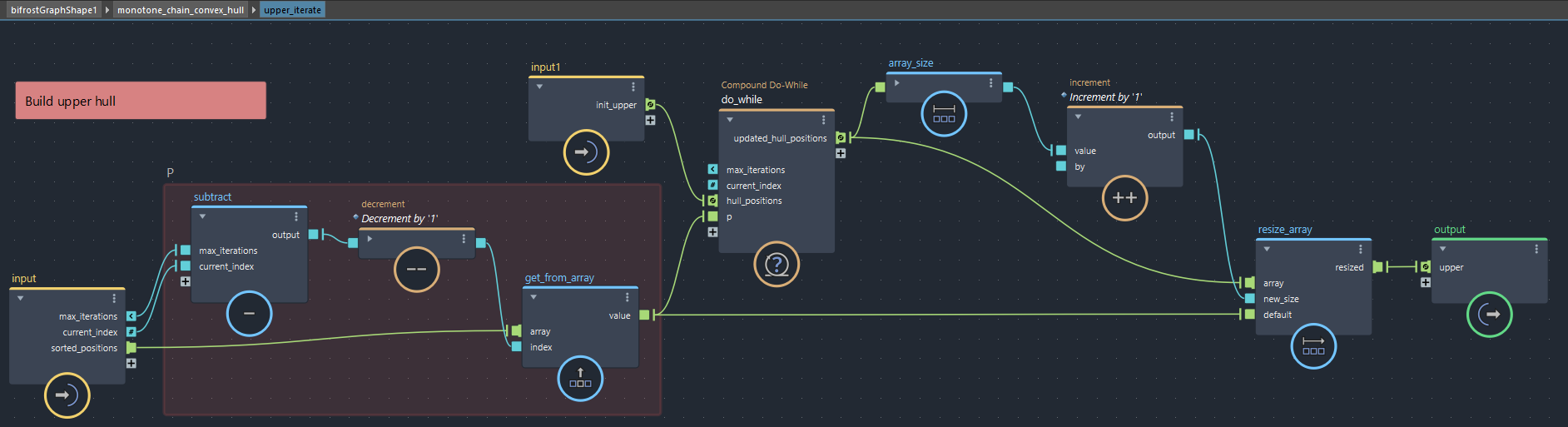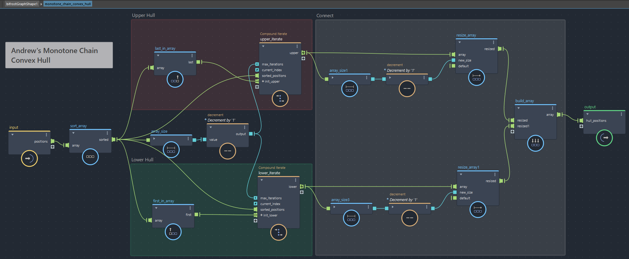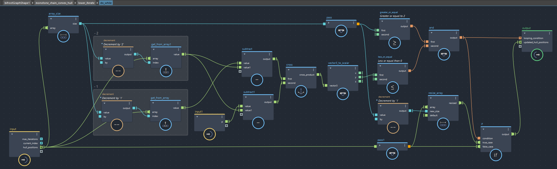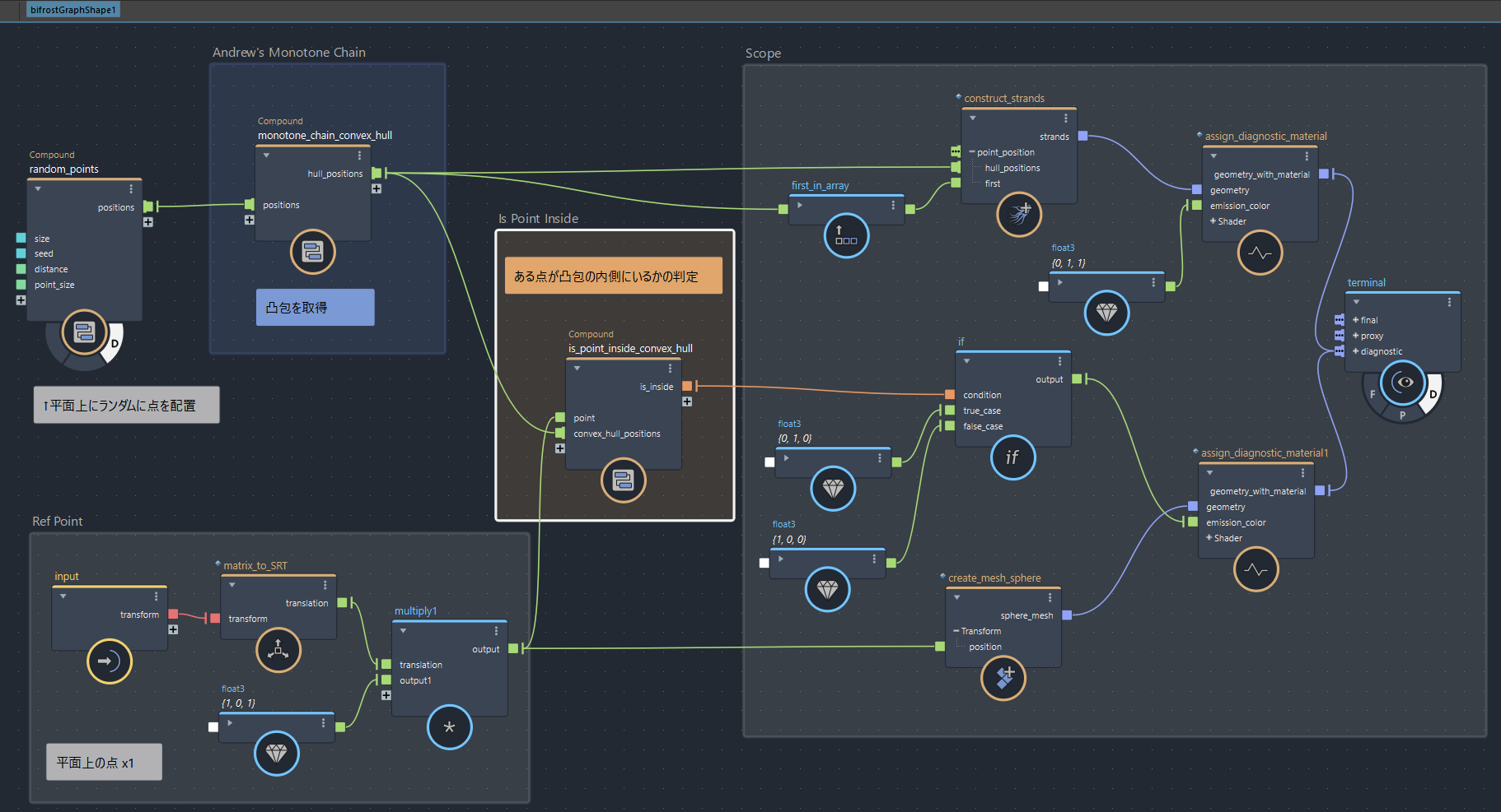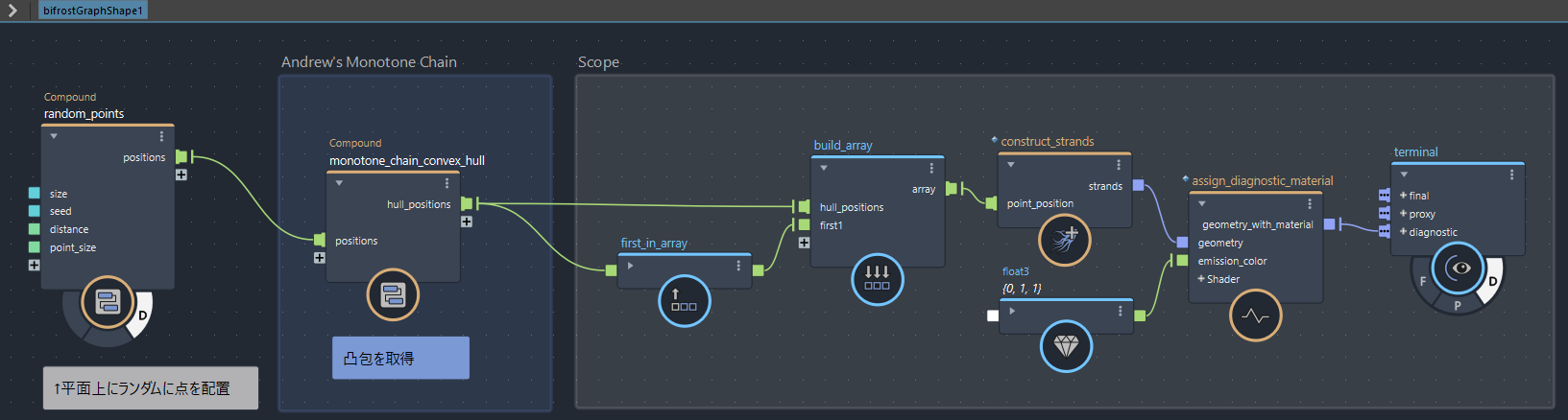平面上の複数の点を全て囲む凸型の面(=凸包)を得るには、Andrew's Monotone Chain (*2) のアルゴリズムが使えそうです。リンク先に多数のサンプルコードが書いてありますので、Pythonコードを参考にしてBifrostグラフで実装します。while が無いので do_while で代用していますが、基本はそのままです。