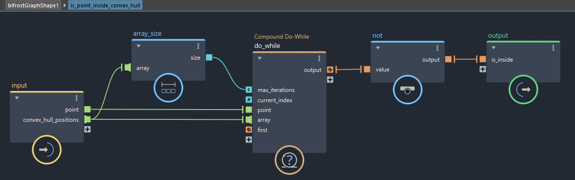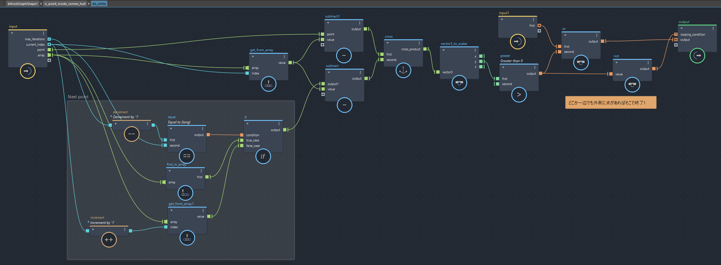 ある点が凸包に収まっているかは『すべての辺において内側にいるか』を確認すれば判定できます。Convex Hullのコンパウンドから出てきた点の配列はすでにキレイに一周した並び順になっていますので、そのまま do_while で回して外積を確認していきます。