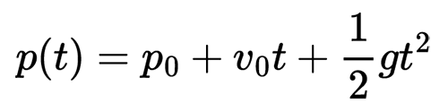 計算に必要な要素はすでにほぼ揃っています。まず、接地・非接地の判定は支持基底面の代表点がひとつでも地面に付いているか否かで判断し、非接地に移行した瞬間(打ち上がった瞬間)の重心位置と速度より、等加速度運動の公式を利用してt秒後の位置を求めます。なお、前項の速度ベクトルはフレーム間の位置差分(cm/frame)として得ているため、初速度 v0 に使う際は Δt で割って単位を cm/s に直します。