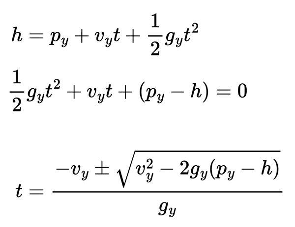 また、打ち上がってから次に地面に到達するまでの時間は、上記の式をy成分に限定して地面の高さhを代入し、tについて二次方程式を解く事で得られます。