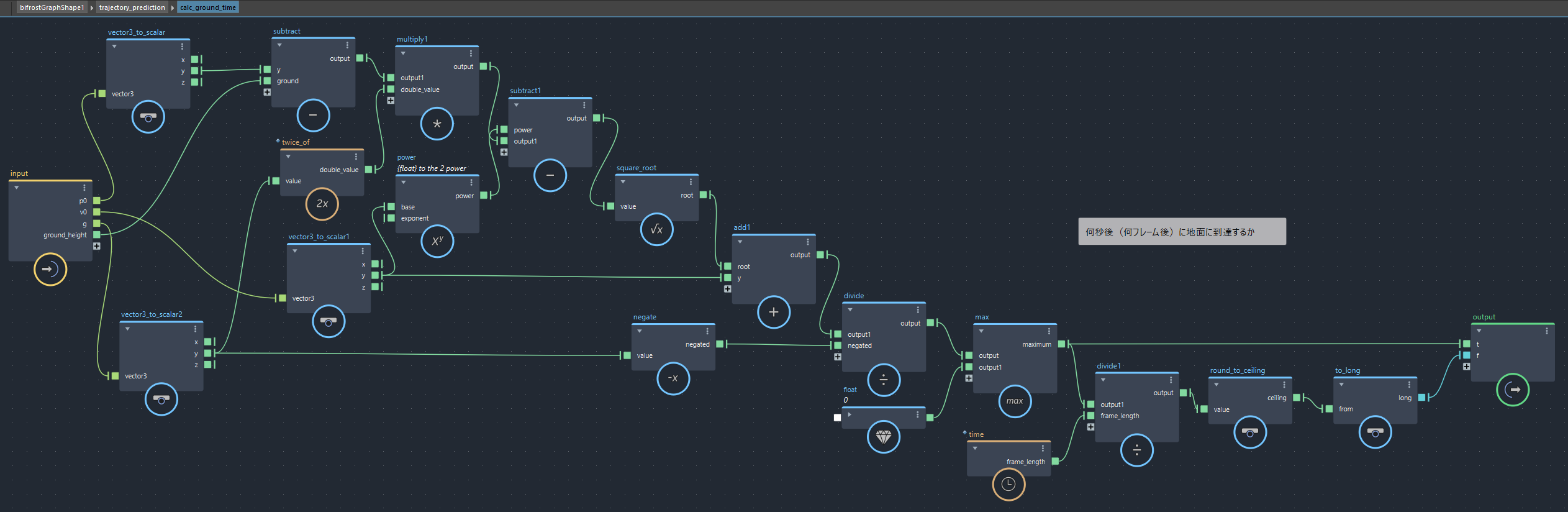 最後のおまけ機能、軌道予測は『地面から離れた瞬間の位置と速度を元に将来の軌道と落下地点を予測する』機能です。これを正確に守ってアニメーションさせる必要はないですが、例えば“ジャンプの勢いが小さかったわりに長距離を飛びすぎている”などの不自然さを視覚化しやすくなります。