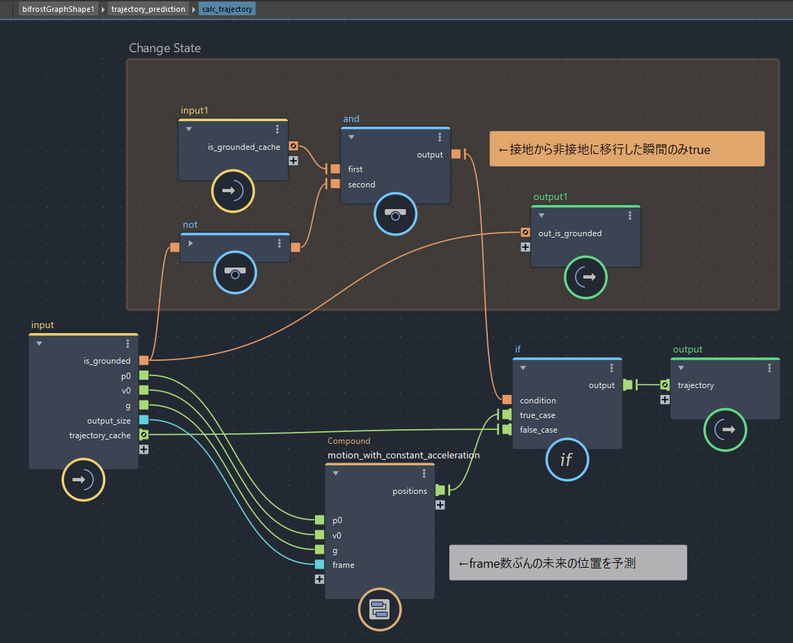 では最後におまけ要素として、ジャンプなどで打ち上がった際の重心の予測軌道を可視化してみたいと思います。軌道は接地状態から非接地状態へ移行した瞬間に計算し、次に再計算されるまで固定するものとします。