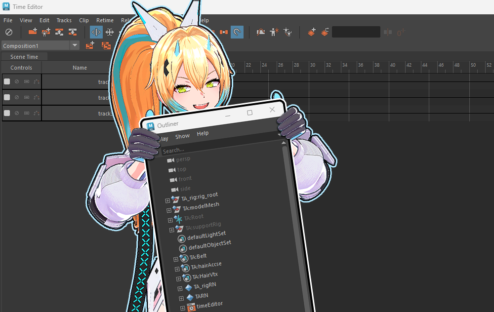カスタマイズしたOutlinerを左側に追加した状態でTimeEditorを起動できています。