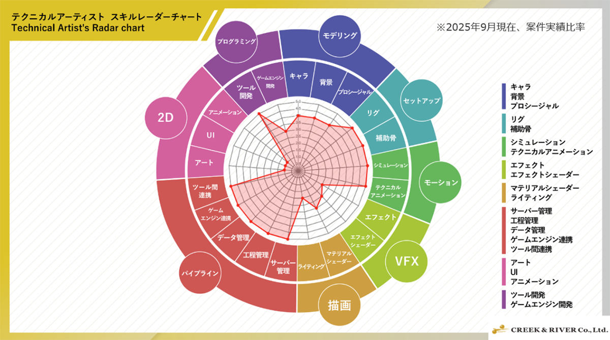 逆に、描画系分野などチャート内でへこんでいる箇所は、まだスタッフが潤沢にいないorプロジェクトのご相談が少ない領域ですので、これからもっと強化していきたいと考えております。…ので、ご応募・ご相談心よりお待ち申し上げております…!