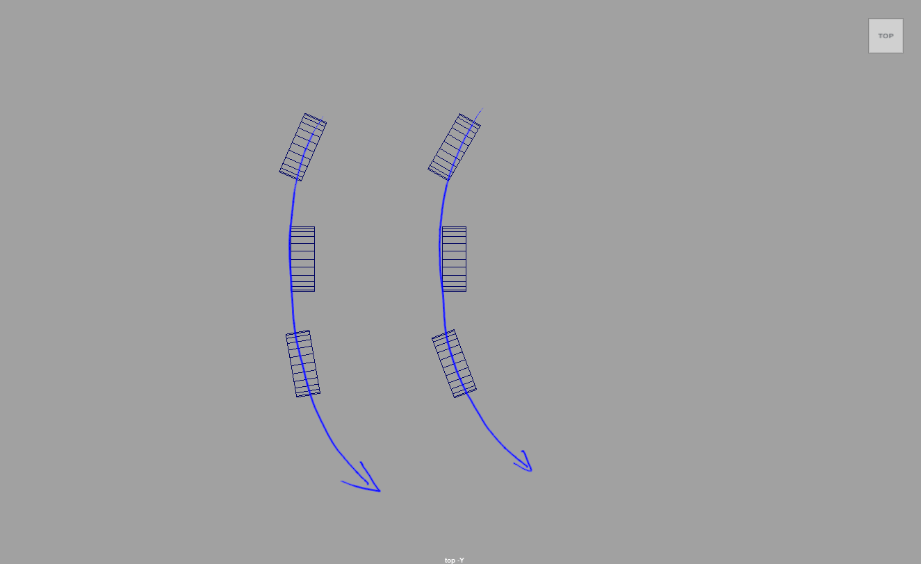 具体的には後輪の軸上に置いた点を中心とした円に沿うように、それぞれのタイヤの向きを合わせます。