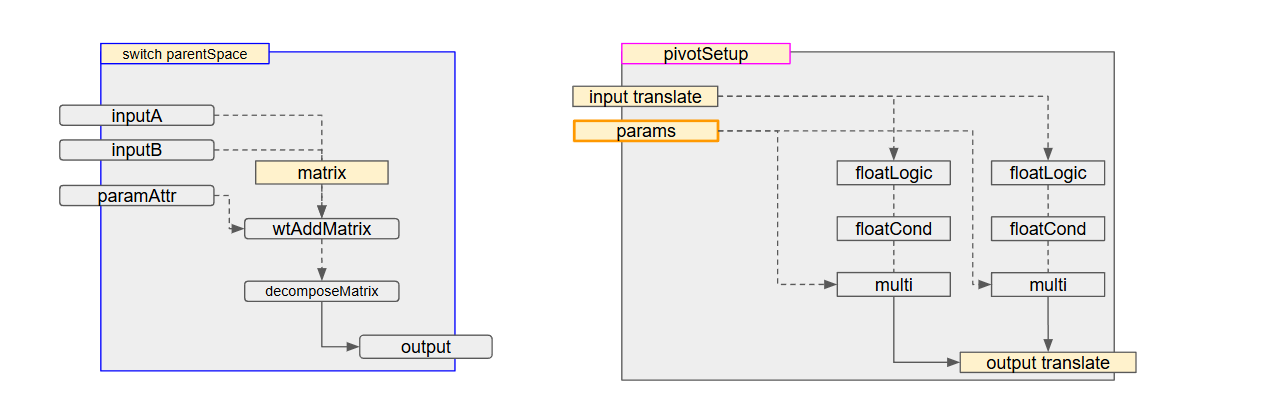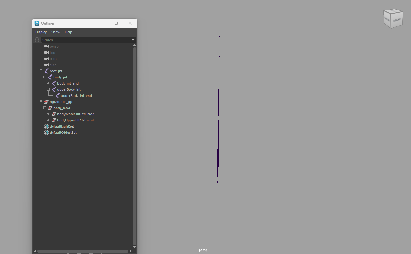 ・水平を維持するギミックを別モジュール(aimConstraintSetup)で作って、tiltCtrlにコントローラーの親空間切り替え機能だけ追加する