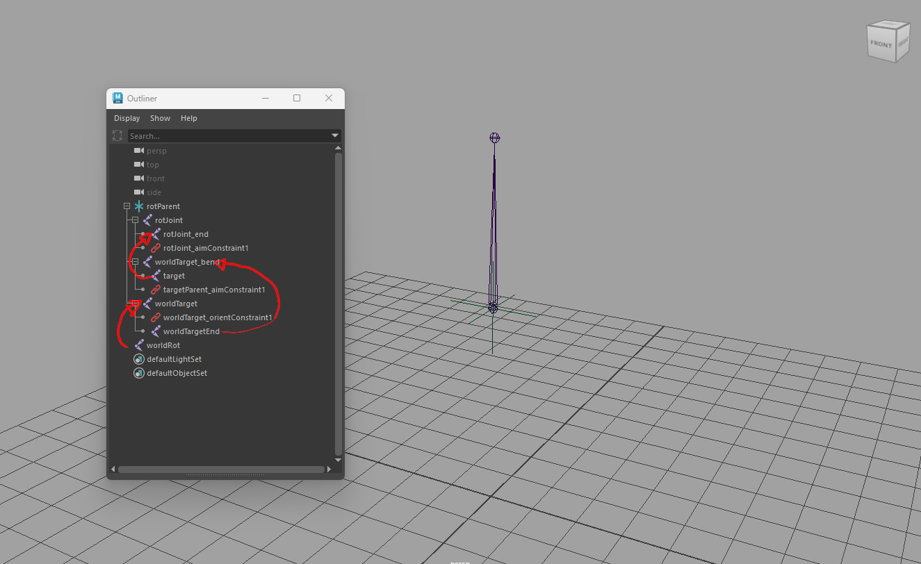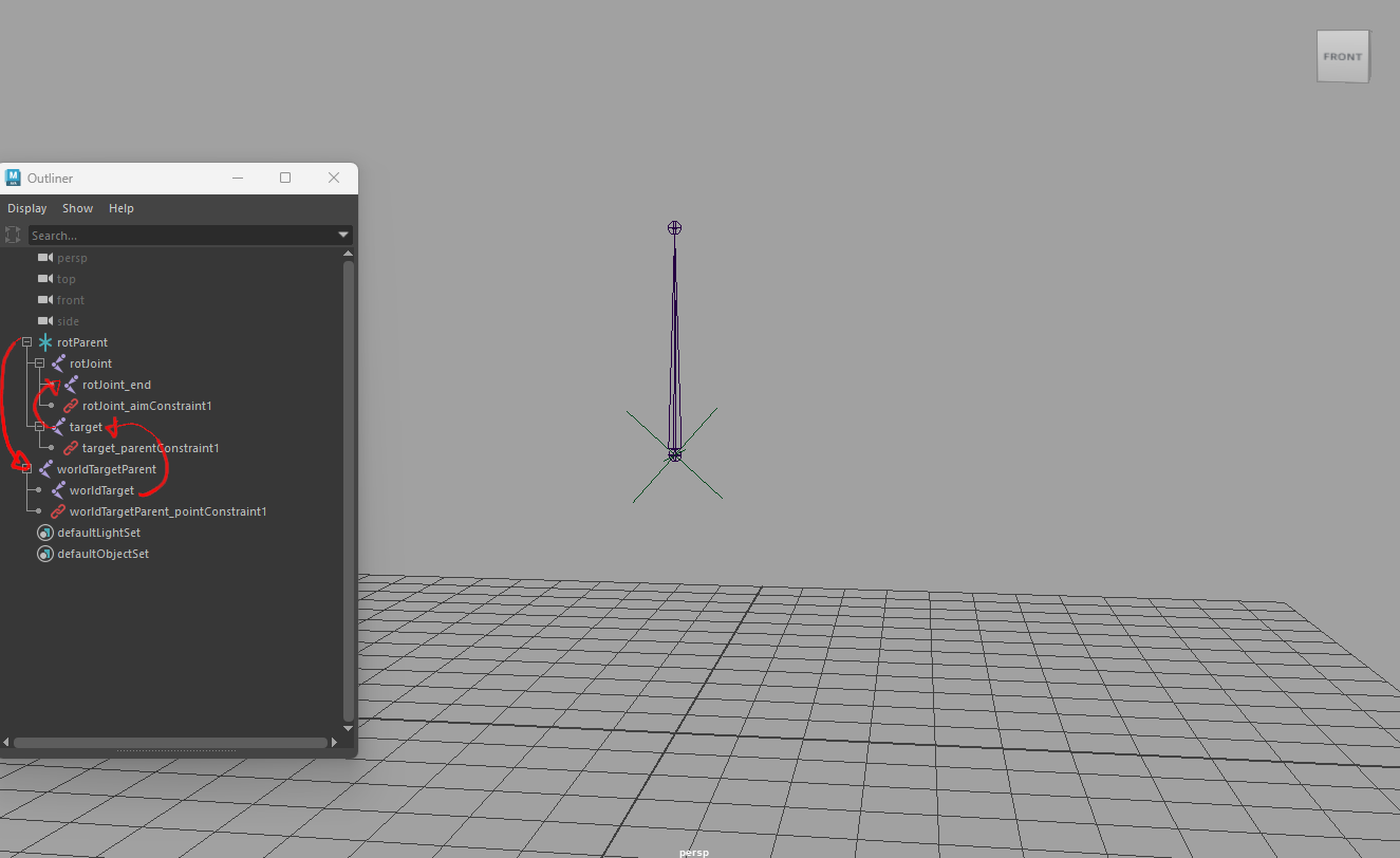 文字で見てもちょっとピンとこないので、aimConstraintを使用して一旦可視化してみました。