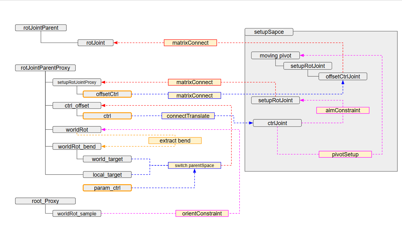 そこからtwist成分(world Y回転)を除外したノード(試作ではaimConstraintを使用)を作成します。
