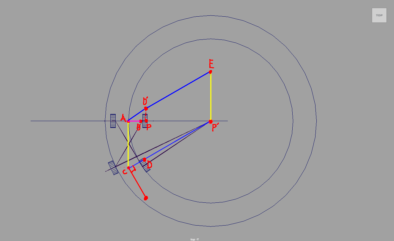 後輪の軸上に置いた点を中心とした円に沿うように、それぞれのタイヤの向きを合わせる必要があります。